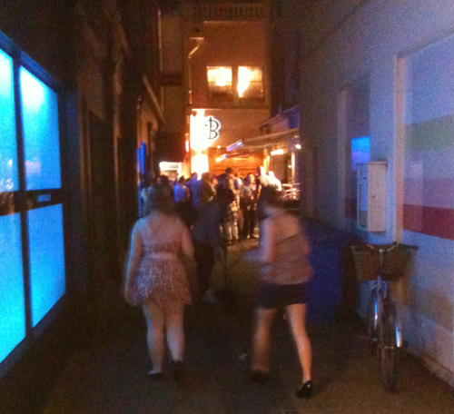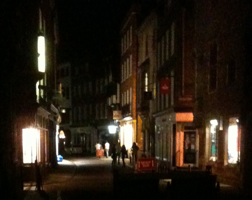We ate lunch at an Italian cafe off the river, and it was very pleasant. Then we went back and fooled around individually until it was dinner time, then met back up in the dining hall. After I was sitting in my room when one of my classmates came and got me for an excursion out on the town, and I couldn’t refuse this first night’s fun. We went to this place called “ta bouche” or something like that which ended up being “la douche” by the end of the night. Toward the beginning of the evening I would say that everyone there were summer students at a Cambridge university, but at a certain point locals started filling in. One of my companions was bound and determined to chat up one of the beautiful women filling the place, so eventually I found myself in an interesting conversation with some girl’s aunt (because he was hitting on the niece, if you can believe that, and the aunt was totally my age). Eventually I had my fill of that sort of thing, because it really isn’t my scene anymore, so I said my goodbyes and headed out around midnight. Everything here is so unreal and scenic, even leaving a Euro trash techno bar looked interesting enough to take a picture of: